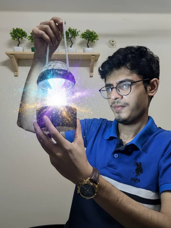 নিচে সাধারণ warm LED আলো (reading / utility light)। উপরে RGB রঙিন ঘূর্ণায়মান লাইট – পার্টি, জন্মদিন, বা রুম ডেকোরেশনের জন্য পারফেক্ট।