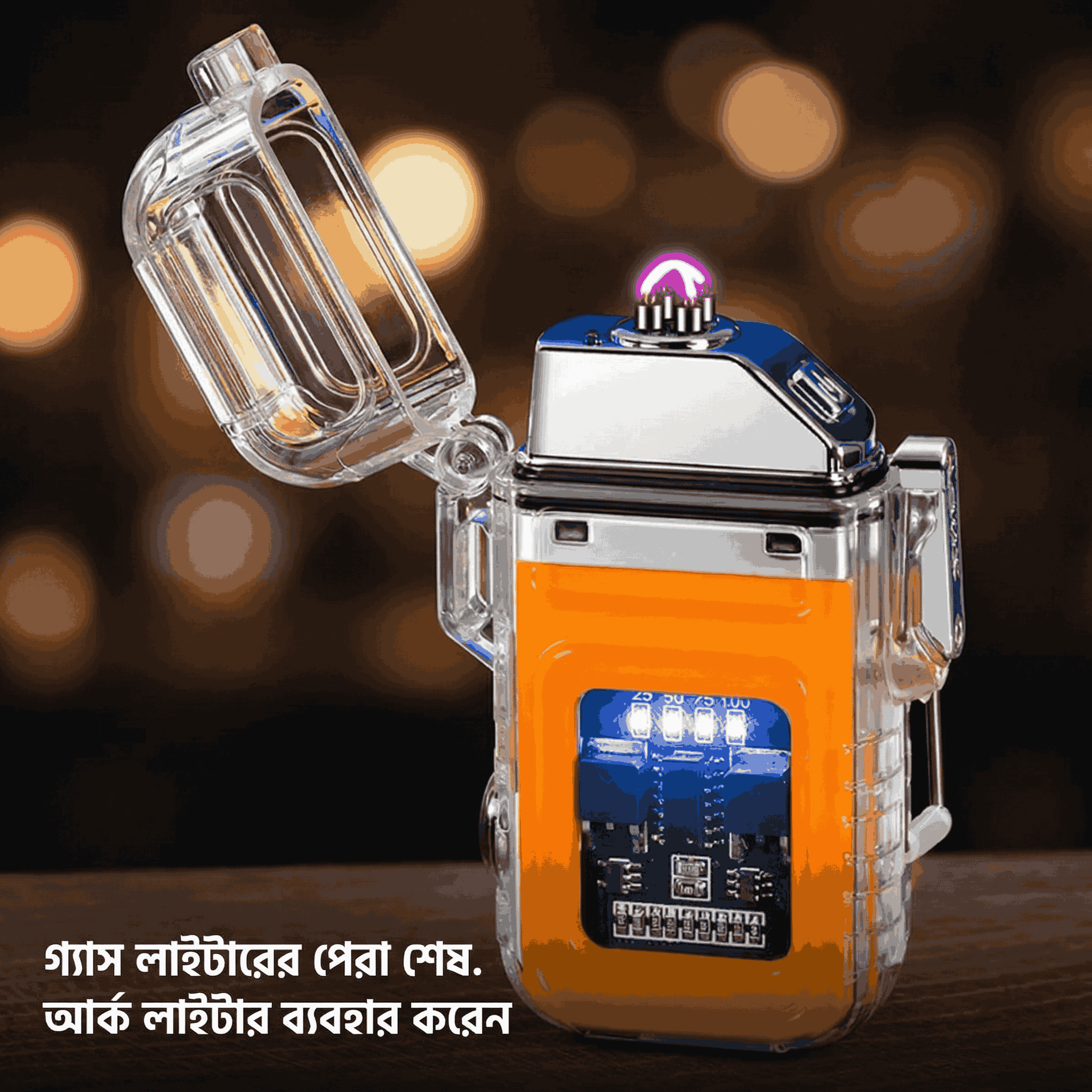 স্টাইলিশ ও টেকসই ডিজাইনের এই প্রিমিয়াম রিচার্জেবল ট্রান্সপারেন্ট ওয়াটারপ্রুফ লাইটারটি আপনার দৈনন্দিন ব্যবহারের জন্য আদর্শ। ট্রান্সপারেন্ট বডি ও আধুনিক LED ডিসপ্লে এটিকে করে আরও আকর্ষণীয়। শক্তিশালী উইন্ডপ্রুফ প্লাজমা ফ্লেম দ্রুত ও নিরাপদভাবে আগুন জ্বালাতে সাহায্য করে। ওয়াটারপ্রুফ ও শক-রেজিস্ট্যান্ট হওয়ায় এটি আউটডোর ব্যবহারের জন্যও উপযুক্ত।